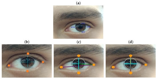 (a) Facial points for left iris recognition. (b) Key points location. (c) Calculation of the distance horizontally traversed by the pupil. (d) Calculation of the distance traveled vertically by the pupil.