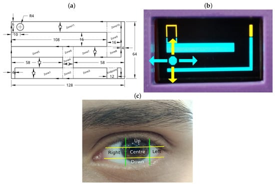 The gaze-controlled navigation is defined by dividing the user’s eye region into five zones. Depending on the pupil’s location, the device executes one of four actions: upward movement (“Up” zone), downward movement (“Down” zone), rightward movement (“Right” zone), or leftward movement (“Left” zone). If the pupil is detected within the center zone, the ball remains stationary. This division enables precise control, enhancing the user’s ability to navigate the maze while exercising the amblyopic eye. Figure 2b demonstrates the corresponding ball movements, while Figure 2c illustrates the segmentation of the eye region.