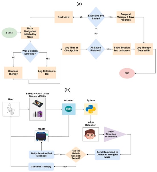 The hardware of the device is centered around the ESP32-CAM microcontroller, chosen for its versatility and ability to function as an IP camera within a private network. This feature enables the real-time capture of the user’s facial images, which is crucial for monitoring and adapting the therapy process. Simultaneously, a 128 × 64 OLED display is integrated to present a visual maze that serves as the core of the therapeutic activity.