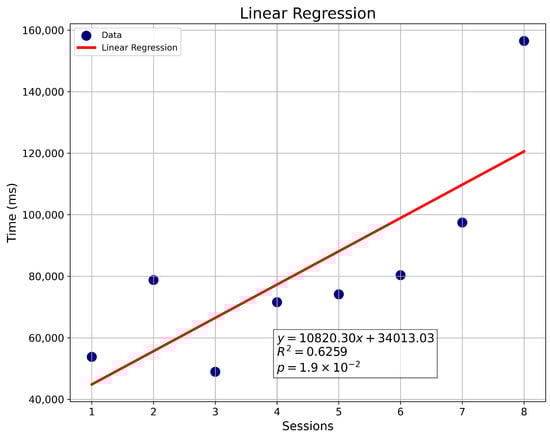 Using these data, weekly linear regressions are generated to assess user progress. Metrics include the number of errors per level and the time required to complete each maze, allowing trends in user performance to be visualized. Regression graphs also include values such as the coefficient of determination (R2), which is the proportion or percentage of variation in the dependent variable []. The p-value is also shown, which is a probabilistic measure linked to evidence against the null hypothesis, where traditionally a p-value lower than 0.05 is considered a threshold for exposing statistical significance []. An example of such analysis is shown in Figure 5.