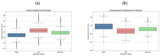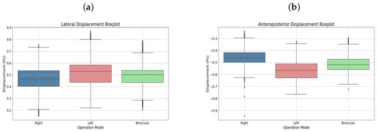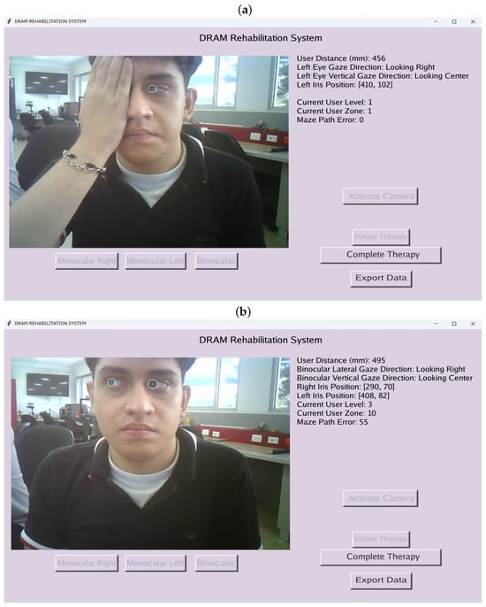 The interface enables users to select therapy types, such as “Monocular Right,” “Monocular Left,” or “Binocular,” as illustrated in Figure 6. During therapy sessions, companions or specialists can monitor users’ eye movements and associated parameters in real time. These include the user’s distance from the device, real-time pupil coordinates, and gaze direction in both lateral and anteroposterior axes. The figure includes a user who granted approval for their appearance in the publication. In addition, validation tests of the device’s eye-tracking performance are presented later.