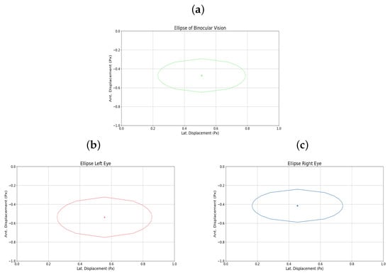 Eye movements are represented through ellipse graphs, illustrating the displacements during each session. These graphs highlight the maximum and minimum lateral and anteroposterior movements, recorded separately for each eye in “Monocular” therapy and as an average for both eyes in “Binocular” therapy. By comparing ellipses from multiple sessions, changes in the user’s eye movements can be tracked over time.