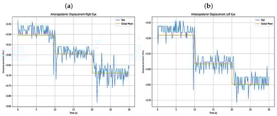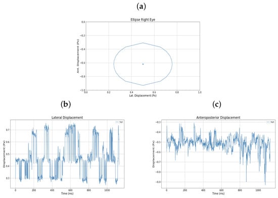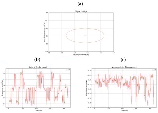 Additionally, a graphical representation of the eye movements over time is generated, providing insight into the extent of lateral and anteroposterior displacements during specific intervals of the session.