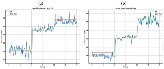 Pupil detection is achieved using eight reference points derived from the facial landmarks provided by the MediaPipe library, outlining the iris of both eyes. Specifically, points 469, 470, 471, and 472 are used for the right eye, while points 474, 475, 476, and 477 are employed for the left eye (Figure 1a). The contour formed by these points is analyzed using the OpenCV function “minEnclosingCircle,” which calculates the circle encompassing the iris. This provides the precise “x” and “y” coordinates of the pupils, located at the circle’s center.