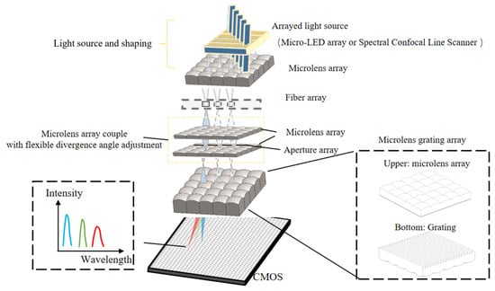 Figure 1 illustrates the structural schematic of the proposed multi-array, multi-channel spectrometer system. The system is designed for testing array-based light sources, such as Micro-LED arrays and spectral confocal line-scan probes. The light source is initially focused and its sub-source size reduced through a microlens array, allowing for efficient coupling into the corresponding channels of an optical fiber array to form an arrayed light source signal. This arrayed light then passes through a scattering angle adjustment module—comprising a microlens array, an aperture, and another microlens array—which flexibly adjusts the output angles in accordance with the diameter of the MLAG subunits. As a result, an arrayed light source with a defined scattering angle is produced. Each sub-source subsequently enters its corresponding MLAG unit, where it undergoes further focusing and dispersion. The resulting spectrally dispersed light is imaged onto a CMOS sensor, enabling the acquisition of spectral signals. The spectral data from all sub-sources are collected simultaneously, thereby achieving multi-channel parallel spectral analysis.