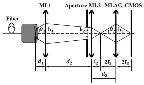 Optical path design of single channel spectrometer. and represent the divergence angles of the light beam at ML1 and MLAG, respectively; , , and denote the beam widths at ML1, ML2, and MLAG, respectively; and are the focal lengths of ML2 and the MLAG lens elements, respectively; and , , and are the distances between key components.