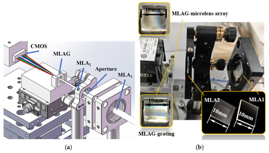 Optical path of array multi-channel spectrometer system: (a) optical path model of the array spectrometer system; (b) actual picture of the array spectrometer system. MLA: Microlens Array; MLAG: Microlens Array Grating; CMOS: Complementary Metal-Oxide-Semiconductor.