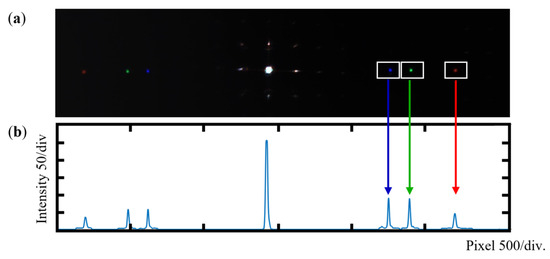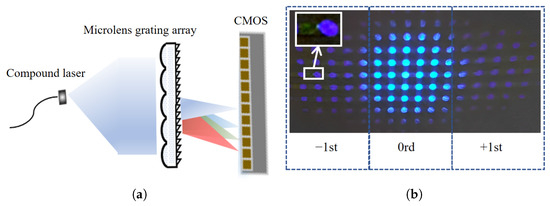 When the beam is aligned perpendicularly to a specific MLAG microlens subunit, the spectrometer parameters are fixed. The three wavelengths are sequentially focused onto the CMOS detector, where 0th-order and ±1st-order diffraction spots are simultaneously captured. As shown in Figure 5a, only the +1st-order diffraction pattern is displayed due to its symmetry with the −1st order; unless otherwise noted, the +1st-order signal is used for analysis throughout this work. Since raw spectral data may be affected by stray light, a simple filtering step is applied to remove background noise. The intensity distribution is then extracted, and the diffraction spot position is determined using a centroid-based method, as illustrated in Figure 5b.