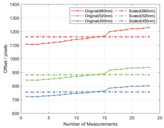 Due to the movement of the microlens array grating relative to the camera during the experiment, the distance between the imaging plane and the grating also changed, resulting in a variation in the overall image size. The solid lines in Figure 6 present the original measurement data arranged in the order in which the experiments were conducted. It can be observed that, as the experiment progresses, the diffraction shifts corresponding to each wavelength increase simultaneously, indicating that the images captured on the CMOS sensor have undergone a consistent scaling in size.