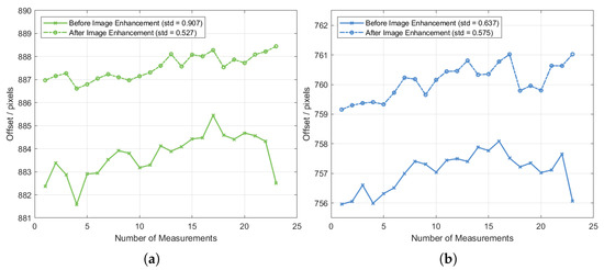 In the experiment, the outer regions of the diffraction spots exhibited low brightness and were susceptible to background noise, leading to a low signal-to-noise ratio. Moreover, the spots were not perfectly circular. To improve spot localization accuracy, an image enhancement algorithm was applied to suppress the brightness of the outer regions and emphasize the high-energy spot centers for centroid detection. After enhancement, the effective spot size was reduced, and centroid positions were recalculated and rescaled. The revised pixel center distances for the +1st-order diffraction spots of different wavelengths are shown in Figure 7. The standard deviations of the enhanced 520 nm and 450 nm spots were 0.53 px and 0.58 px, corresponding to spectral widths of 0.26 nm and 0.35 nm, respectively.