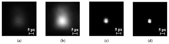 - Contrast enhancement for each spot and its local background using linear mapping:where min and max denote the minimum and maximum brightness in the selected region. The result is shown in Figure 8b.