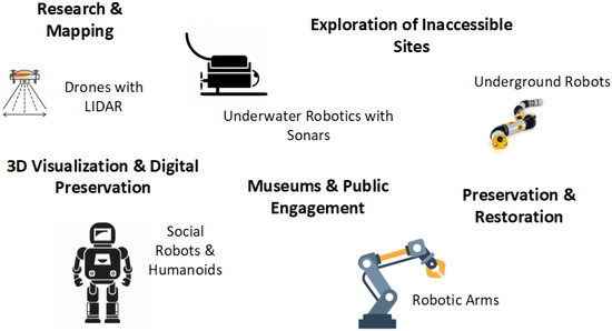 An emerging interdisciplinary field at the intersection of archaeology and robotics has gained significant attention in recent years, aiming to explore, study, and preserve cultural monuments and archaeological findings uncovered through excavations (Figure 2). This important collaboration between the humanities and engineering enables the adaptation of technological solutions to the specific needs of archaeological research and fieldwork while also contributing to the preservation and sustainable management of cultural heritage [27]. Robotics applications, in particular, have introduced new capabilities for mapping, visualization, and in-depth analysis of archaeological sites. Notable innovations include the use of drones and 3D imaging technologies, which—both individually and in combination—support the creation of interactive tools and promote a deeper, broader understanding of cultural heritage.
