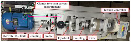 The experimental validation of ITSC fault detection was carried out using a fully instrumented motor test bench, shown in Figure 3, designed for monitoring current waveforms, collecting real-time performance data, and inducing controlled faults under various load and speed conditions. The setup integrates a three-phase squirrel cage IM coupled to a magnetic powder brake, a digital tension controller, an oscilloscope, an industrial inverter drive, and a monitoring PC running dedicated motor control software (Figure 3).