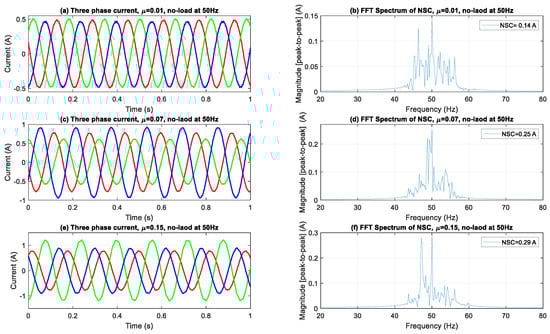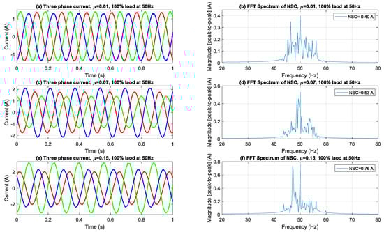 Figure 6 illustrates that during full-load operation, the effects of the ITSC faults are significantly amplified. Significant amplitude imbalances and waveform distortions are observed as fault severity escalates. The NSC spectra reveal a marked increase in the fundamental component, with the severe fault scenario (NSC ≈ 0.76 A) displaying predominant spectral peaks and greatly amplified sideband components. The proliferation of these harmonics highlights the escalating interplay between stator asymmetry and rotor dynamics under elevated torque requirements, thus enhancing the spectrum data accessible for diagnostic analysis.