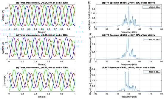 Three-phase current waveforms and FFT spectra of NSC under 50% load.