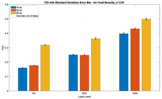 FDI values for fault severity μ = 0.01 across varying load and frequency conditions, with ±1σ error bars from three independent trials.