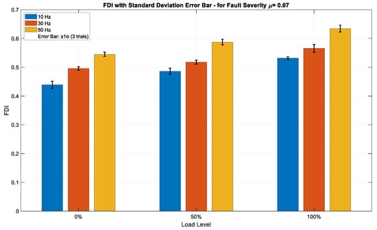 FDI values for fault severity μ = 0.07 across varying load and frequency conditions, with ±1σ error bars from three independent trials.