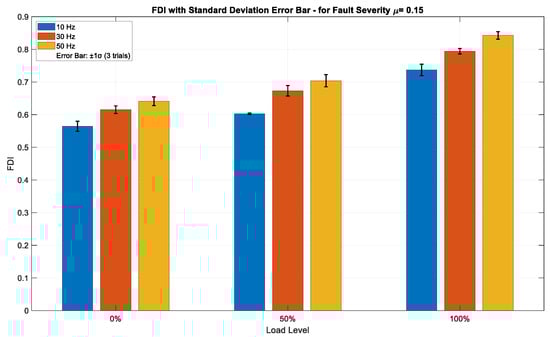 FDI values for fault severity μ = 0.15 across varying load and frequency conditions, with ±1σ error bars from three independent trials.