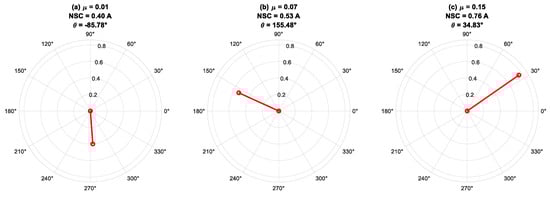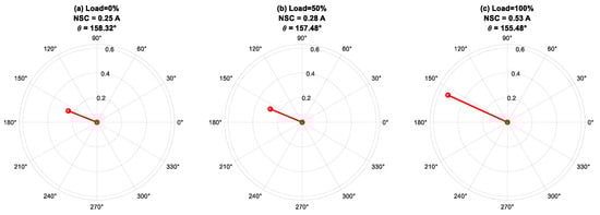 Figure 11 displays the phase-angle response of the fundamental component of the NSC at 50 Hz, assessed under a constant fault severity of μ = 0.07 throughout load levels of 0%, 50%, and 100%. The analysis indicates that the phase angle of the NSC is predominantly unaffected by load fluctuations, highlighting its significant reliance on the location of the faulty phase rather than the loading conditions. The consistent stability of the phase angle under different mechanical loads demonstrates the reliability of θI2 as an effective signal for fault-phase localization. Minor angular fluctuations observed at various load levels are ascribed to non-ideal factors, including magnetic saturation, and intrinsic asymmetries in the stator winding and supply system. The NSC magnitude’s sensitivity to load variations, along with the phase angle’s relative insensitivity, highlights the complementary functions of both parameters in delivering thorough diagnostic insights for early defect detection and severity evaluation in an IM.
