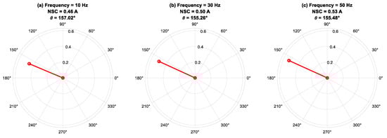 Figure 10 illustrates the phase-angle characteristics of the fundamental component of the NSC at 50 Hz under full-load conditions, with differing fault severities applied across various stator phases of the IM. The findings indicate that the NSC phase angle (θI2) is predominantly influenced by the fault’s phase position rather than its intensity. Faults in phases A, B, and C generate phase angles approximately centered at 0°, 120°, and −120°, respectively, aligning with theoretical predictions. The observed fluctuations in NSC magnitude indicate alterations in fault severity, but minor discrepancies in phase angle are ascribed to intrinsic machine asymmetries and measurement noise. This investigation underscores the efficacy of NSC phase-angle monitoring as a diagnostic instrument for precise fault-phase identification, with NSC magnitude offering additional insights into fault propagation and severity.