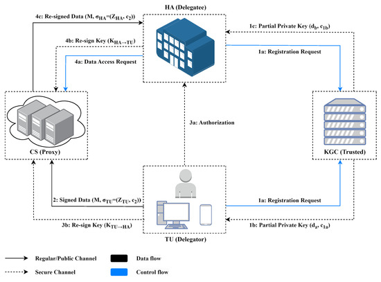 - Cloud Server (CS): A cloud service platform designed for the storage, processing, and dissemination of the TU’s health data. The CS validates the cryptographic signature of incoming data from the TU before ingestion. Upon a valid request from an HA, the CS executes a proxy re-signature protocol to delegate access.