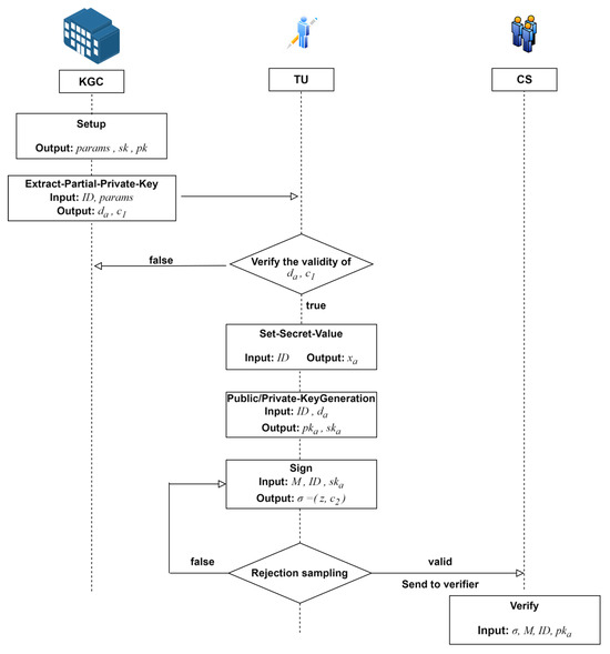- Terminal User (TU): An entity representing the data owner and their associated medical devices, characterized by limited computational and storage resources. The TU obtains system parameters and a partial private key from the KGC upon registration, after which it digitally signs personal medical data (e.g., EHRs) for transmission to the CS.