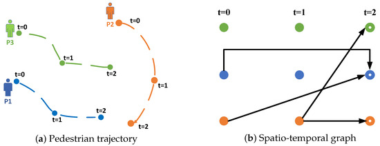 We characterize the multimodal spatio-temporal graph using a binary adjacency matrix that delineates the relationship between current observations and historical events as a directed acyclic graph. At time t = 2 , the directed edges depicted in Figure 1b suggest a possible unilateral interaction between the pedestrians represented by the source node and those identified by the destination node. This interaction may extend throughout a time interval τ = { 0 , , t 1 } , demonstrating how one individual’s historical behavior can affect another’s subsequent choices. Our hypothesis asserts that each pedestrian x t is influenced by their prior behavior x 0 : t 1 as well as by other pedestrians at possibly varying temporal instances.