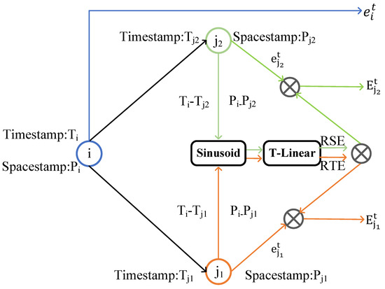 Specifically, for two pedestrians with different temporal and spatial positions, they are defined as two nodes, i and j, and their relative time interval can be expressed as Δ T i j = T i T j , which serves as an index for deriving the relative spatio-temporal coding R T E Δ T i j . Note that the training dataset does not cover all possible time gaps; thus, the relative temporal encoding should be capable of generalizing unseen times and time gaps. Due to the periodicity and smoothness properties of sine and cosine functions, we base our design on the positional encoding mechanism of Transformers and propose a method that combines fixed sinusoidal functions with an adaptable linear projection, denoted as T-Linear* : R d R d . This combination forms the basis for the relative time encoding of RTE, and the equation is presented as follows: