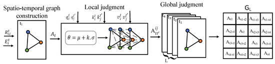 Figure 4. In multiple-spatio-temporal mapping, various spatio-temporal maps are generated by layering maps from distinct time points. This entails computing the weights of pedestrians at different intervals concerning the current target pedestrians, conducting a localized assessment to discern any influences, and selecting L moments with the most significant interactions with the present moment following a global evaluation to execute the multiple-spatio-temporal-map modelling.
