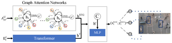 Figure 5. We employ a GAT and a Transformer network to jointly capture pedestrian interaction dynamics. The GAT processes spatio-temporal interactions among pedestrians to generate h S T G , while the Transformer focuses on learning long-term interactions and produces h T . Finally, h S T G and h T are concatenated and fed into the decoder to generate real-world 2D coordinates.