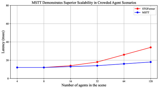 Figure 6. The inference latency of two models (MSTT and STGformer). The red curve represents the STGformer model, while the blue curve represents the MSTT model.