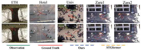Figure 7. Qualitative results for the ETH/UCY dataset. For each pedestrian, we show the path history (green line), the future true path (red line), the STGformer prediction results (yellow dashed line), and the prediction results of our MSTT (blue dashed line).