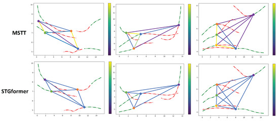 The multi-spatial graph neural network consists of multiple graph attention layers. Each graph attention layer processes the node features E i t and the augmented adjacency matrix G L as inputs, generating the expected trajectory features shown in Figure 5. The model employs multi-head attention, characterized by four distinct heads represented by dashed, solid, dotted, and dash-dot lines. Upon obtaining various node features, each head consolidates these features to derive the final trajectory feature h S T G .