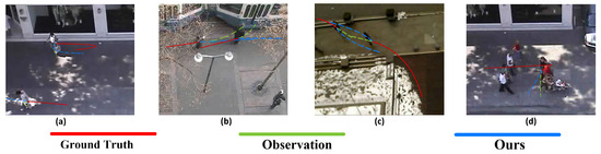 Figure 9. Qualitative evaluation reveals four characteristic failure modes: (a) peripheral observation artifacts, (b) occlusion-induced deviations, (c) collective motion discontinuities, and (d) high-curvature path miscalculations, where red, green and blue trajectories denote ground truth, observed data, and model predictions respectively, and the prediction results of our MSTT (blue dashed line).