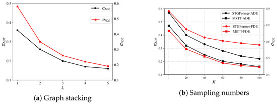 Figure 10. (a) Analysis of various graph stacking numbers and their effect on the MSTT model’s efficacy; (b) evaluation of differing sampling numbers in relation to ADEs (black line) and FDEs (red line) for two models.