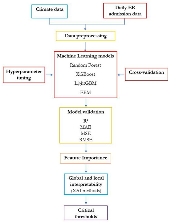 - Monteiro Martins, L.; Coz, E.; Maucort-Boulch, D.; Hacid, M.S. Machine learning with environmental predictors to forecast hospital visits and admissions: A systematic review. Environ. Syst. Res. 2025, 14, 12. [Google Scholar] [CrossRef]