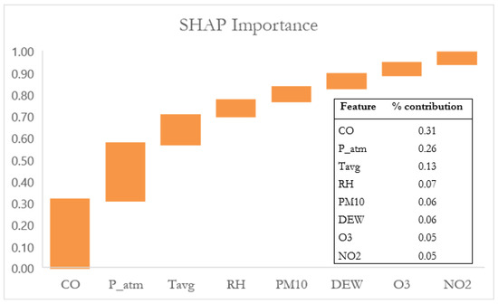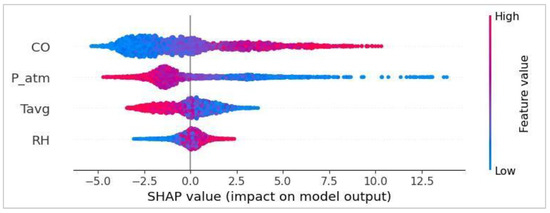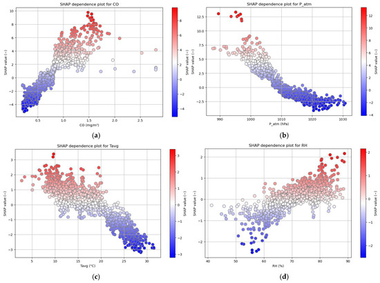 Beyond predictive performance, one of the central goals of this work is model transparency and interpretability. Therefore, in addition to the prediction phase, considerable attention was given to analyzing model behavior through both global and local interpretation tools [27,28,29,30]. In particular, the use of SHAP (SHapley Additive exPlanations) enabled an in-depth understanding of the variables most influencing the model outputs, both at an aggregate level (via Bee Swarm plots) and at the individual level (via SHAP dependence plots) [31]. The most influential variables—namely, carbon monoxide, atmospheric pressure, average temperature, and relative humidity—were further explored through local analysis.