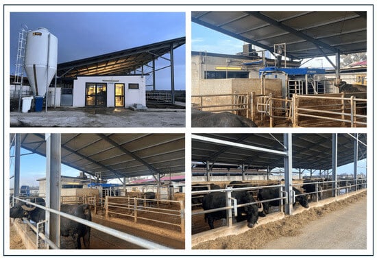 The feeding system administered a total mixed ration (TMR), distributed twice daily. Buffalo that could be milked entered the holding area to the side of the AMS and moved independently to the milking station. Otherwise, they were diverted to the feeding area. The AMS used a standard configuration similar to that used for dairy cows, with the following operating parameters: vacuum at 42 kPa, 60 cycles/min, and a pulse ratio of 60%. The amount of concentrate fed to each buffalo at the milking station varied from 0.5 to 3.0 kg/day, depending on daily milk production. This adaptive system made it possible to optimize the feeding of the buffalo by providing them with amounts of concentrate proportional to their actual productivity, reducing waste, and increasing the efficiency of the production process.