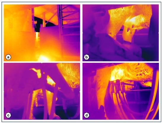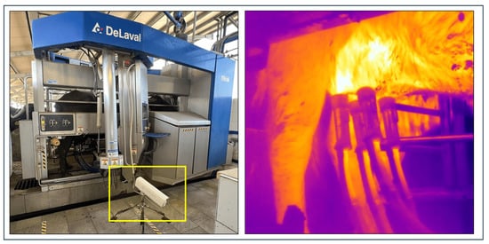 In fact, without the implemented automated acquisition system, in this type of innovative barn, it would have been necessary to use multiple operators to manually capture thermal images, ensuring continuous coverage throughout the 24-h period during which buffalo may be milked. This would prevent data loss and allow for uninterrupted monitoring of all animals. The use of multiple operators would also introduce additional factors of variability and uncertainty into the measurement system, including fatigue effects that arise from prolonged repetitive tasks. To illustrate, in a single day of acquisition, with a group of 60 buffalo milked approximately 2.4 times per day, the images to be processed and correlated with other data amount to 144. The thermal camera has been strategically positioned on the lateral and rear sections of the milking robot (Figure 2).