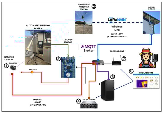 However, although installing an infrared camera on the milking robot appears to be the most logical choice, considerable technical effort was required to design and implement a custom system capable of ensuring synchronized acquisition and automatic, reliable storage of thermal images of the udders, given the lack of standardized protocols. The automated measurement station developed, shown in Figure 3, consists of the following: