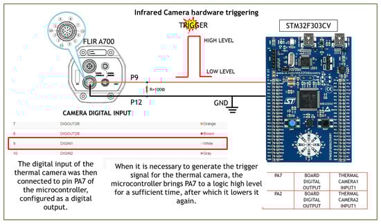 The chosen thermal camera sensor is the FLIR A700, which offers high-resolution thermal imaging (640 × 480 pixels) with a sensitivity of <30 mK, supports temperature measurements from −20 °C to 2000 °C and various lens options (14°, 24°, and 42°), and integrates seamlessly into industrial systems with advanced connectivity protocols. The thermal camera is enclosed in a waterproof IP66 housing with a germanium lens in order to protect it from potential impacts with the milking equipment, animal waste (urine and feces), as well as water and detergent used by the robot during cleaning cycles. The lens blocks wavelengths in the UV (ultraviolet) and VIS (visible) spectra but allows IR (infrared) wavelengths starting from 2 m to pass through. In addition to its very good performance characteristics, the thermal camera features digital I/O (input/output) ports on the rear panel, facilitating seamless integration into an automated measurement and control system. For example, the digital inputs can be configured to detect a transition from low to high in a direct current voltage signal (trigger event) and perform a specific action upon the trigger event, such as capturing a thermal snapshot or recording a video clip of several seconds (Figure 4). It is possible to capture a thermal image at a given time instant by timing a trigger signal. A digital output can be configured to generate an alarm signal or activate a relay when a set temperature threshold is exceeded. The thermal camera is installed on the local network with the IP address 192.XXX.X.151.