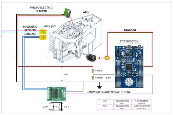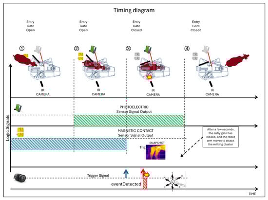 By monitoring the status of the non-contact magnetic sensor in addition to the photocell, the control unit can recognize that the buffalo has entered the robot, is in the correct position, and that the start of milking is imminent. In the short time between the closing of the entry gate and the start of the movement of the robot arm, the control unit must generate the trigger signal for the thermal camera to take the optimum thermal image of the udder (Figure 6).