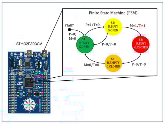 The firmware of the microcontroller for the optimal management of the thermal photocell trigger was structured according to the architecture of a finite-state machine, consisting of four states with two inputs: the photoelectric sensor (P) and the contactless magnetic sensor (M) and a single output, the trigger (T) (Figure 8).