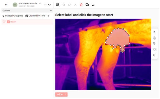 The provided camera tools already allow the definition of an ROI within the image of different shapes (square, circular, and elliptical) and sizes, from which the maximum temperature can be extracted. However, whatever ROI is chosen, it can never perfectly coincide with the udder area, which has a very irregular morphology, leading to a possible loss of measurement accuracy.