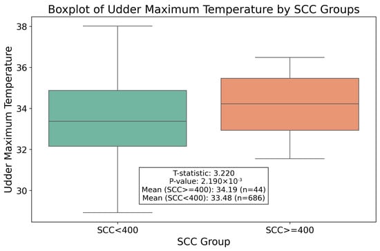 This analysis aimed to assess if higher OCC values were associated with higher maximum udder temperatures recorded by our system, since if the temperature measurements were correct, this trend would be present [28]. By conducting such an analysis, we wanted to explore the possibility of using such an automatic system to monitor udder health in real-time with the non-invasive approach provided by thermal imaging.