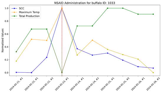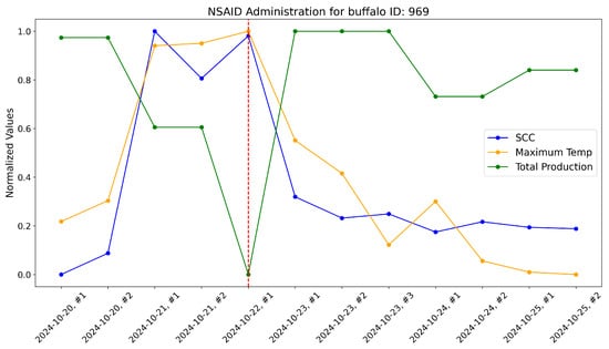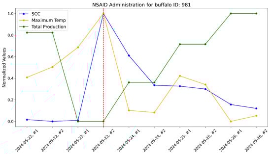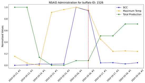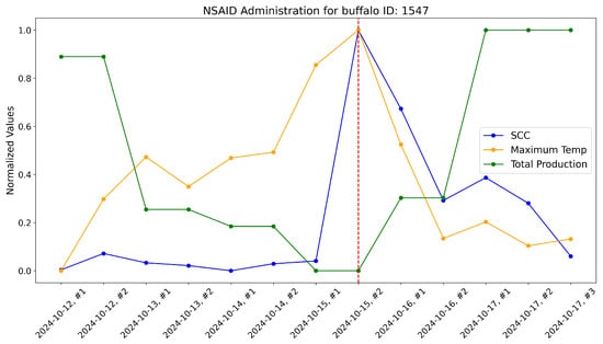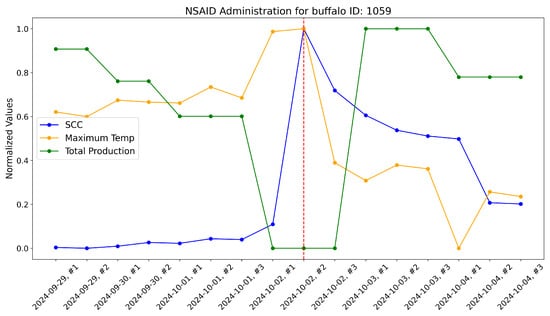 According to the veterinarians, these buffalo exhibited behaviors typically associated with subclinical mastitis. For these, the maximum udder temperature monitored by our system increased well before a significant rise in the somatic cell count, which usually marks the onset of mastitis infection. These trends were evident when comparing the variations in these variables over time within the same plot. As a reference, the time-aware variations in maximum udder temperature, somatic cell count, and milk production (normalized) are shown for these specific animals in Figure 17, Figure 18, Figure 19, Figure 20, Figure 21 and Figure 22.