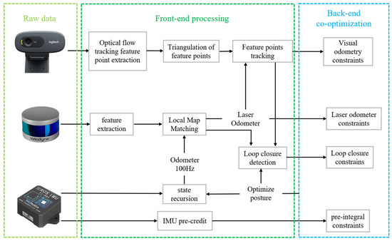 SLAM processing pipelines showing the LiDAR, camera, and IMU data processing, front end, and back-end processing.