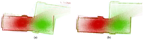 Registered point clouds with different methods: (a) traditional feature extraction and (b) our method. The red and green point clouds are two consecutive frames of a point cloud. Compared to traditional methods, we are able to register more accurately.