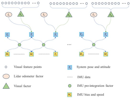 where denotes the state vector of the IMU in the sliding window, which contains the position, velocity, and attitude represented in the world coordinate system; and are the accelerometer and gyroscope bias error of the IMU, respectively. The back-end also optimizes the inverse depth information of the visual feature point with being the total number of visual feature points to be optimized in the sliding window. Figure 4 shows the constraints constructed by sensor observations in the back-end state estimation model. The sensor observations provide three categories of constraint factors, namely IMU pre-integration factor, visual reprojection constraint factor, and LiDAR odometry factor. They constrain the state quantities to be optimized in the sliding window, i.e., velocity, position, attitude, and IMU bias, respectively.
