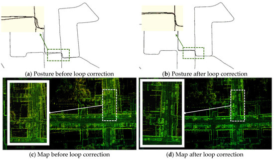 When mapping extensive environments, noise accumulation gradually increases errors. Figure 5a exhibits a trajectory without loop constraints, revealing poor overlap in the loop area, indicated by green lines, and a subpar fitting effect. Conversely, Figure 5b incorporates a loop detection module, correcting the initial offset and enhancing the fitting quality. Without loop constraints, Figure 5c demonstrates a noticeable “ghost” issue in the loop area, compromising the drawing quality. However, Figure 5d integrates the loop detection module, effectively resolving the ghost problem and enhancing the drawing’s clarity. The introduction of a visual loop detection module further optimizes the pose estimation of the LiDAR odometer and mapping algorithm, leveraging geometric and intensity information for precise pose determination.